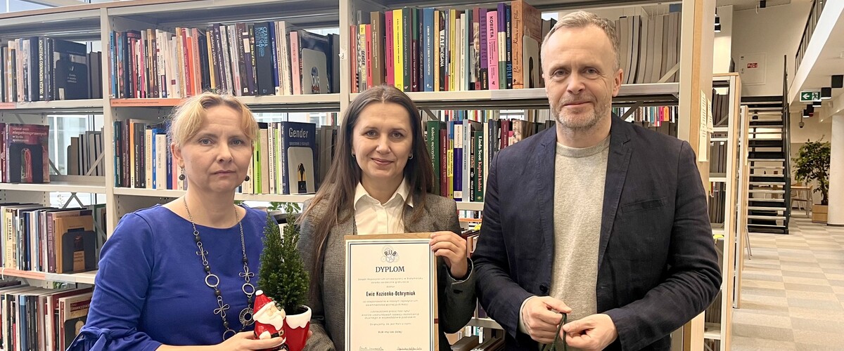 Z tej okazji dr Ewa Kuzionko-Ochrymiuk otrzymała pamiątkowy dyplom oraz nagrodę-niespodziankę, które wręczyli prof. Marek Kochanowski, dyrektor Biblioteki Uniwersyteckiej, oraz Agnieszka Gałecka-Golec, kierownik Repozytorium UwB.